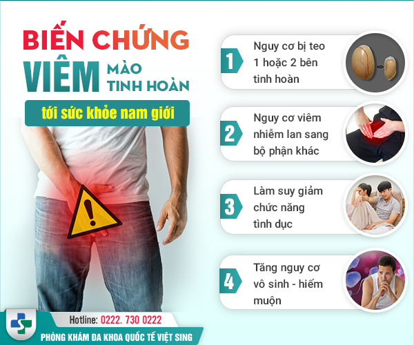 - Gây vô sinh ở nam giới: Vô sinh là biến chứng nguy hiểm của viêm mào tinh hoàn cũng như viêm tinh hoàn. Nếu không được chữa trị sớm, tinh hoàn bị viêm sẽ bị teo dần, các tế bào sinh tinh bị tổn thương, lâu dần sẽ mất hoàn toàn chức năng và vô sinh là hệ quả tất yếu.