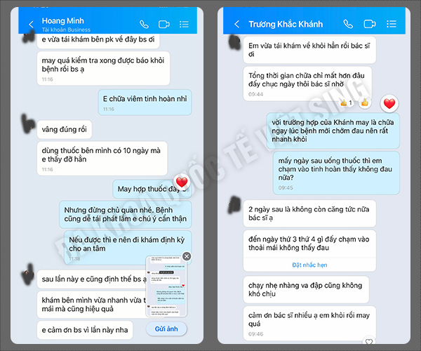 - Anh Hoàn Hoa Th (35 tuổi, Bắc Giang) chia sẻ: “Mình đã điều trị viêm mào tinh hoàn khỏi tại phòng khám được 3 tháng nay rồi và vẫn tiếp tục qua khám định kì để đảm bảo sức khoẻ ổn định và có kết quả rất tốt. Trước khi được chữa bệnh khỏi hẳn tại đây mình đã mất tiền oan cho mấy nơi cơ, may gặp phòng khám qua chia sẻ của các anh em trong hội nhóm nên khoẻ mạnh và rất vui mừng.”