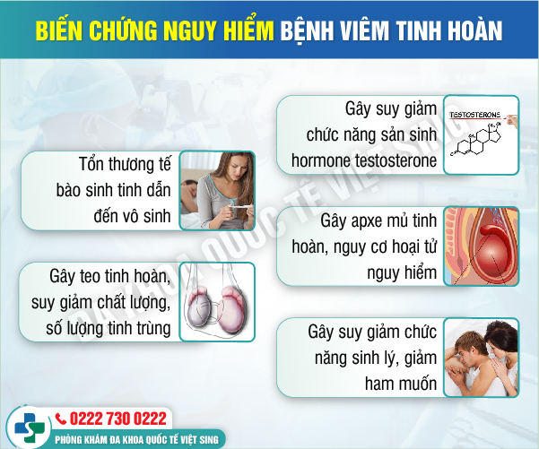 - Gây vô sinh ở nam giới: Vô sinh là biến chứng nguy hiểm của viêm tinh hoàn. Nếu không được chữa trị sớm, tinh hoàn bị viêm sẽ bị teo dần, các tế bào sinh tinh bị tổn thương, lâu dần sẽ mất hoàn toàn chức năng và vô sinh là hệ quả tất yếu.