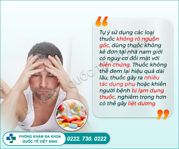 Với tình trạng này, các bác sĩ tại Đa khoa quốc tế Việt Sing Bắc Ninh cảnh báo: “Với các loại thuốc “ngầm”, được truyền tai nhau giữa cánh đàn ông, tác dụng chưa được nghiên cứu rõ ràng, khoa học, có khả năng gây hại sức khoẻ như: cương đau dương vật kéo dài, dẫn đến liệt dương, suy giảm khả năng sinh dục,…