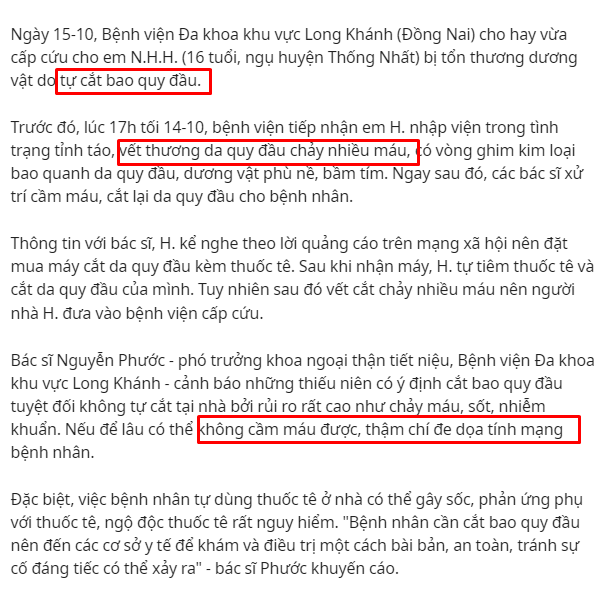 Theo các bác sĩ chuyên khoa, cảnh báo những nam giới có ý định cắt bao quy đầu tuyệt đối không tự cắt bao quy đầu tại nhà vì rủi ro rất cao, không thể cầm máu, nhiễm trùng, thậm chí đe dọa tính mạng.