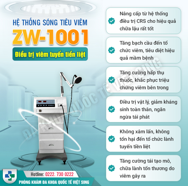 Thiết bị sóng tiêu viêm ngoài cơ thể ZW-1001 thay thế hoàn toàn các phương pháp điều trị bệnh lậu khác với công nghệ sóng ngắn giúp tăng cường tuần hoàn máu và sản sinh các phân tử miễn dịch. Kết hợp hợp chất axit amin nhằm ức chế sự phát triển của vi khuẩn lậu, đẩy nhanh quá trình tiêu viêm và hồi phục tổn thương.