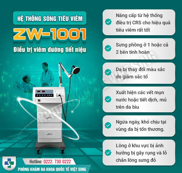Trường hợp nam giới đi tiểu ra máu do viêm đường tiết niệu, bác sĩ tại Đa khoa quốc tế Việt Sing Bắc Ninh sẽ chỉ định điều trị bằng cách sử dụng thiết bị sóng tiêu viêm ZW-1001. Phương pháp giúp tiêu diệt hoàn toàn vi khuẩn gây bệnh, điều trị các triệu chứng mà không để lại biến chứng.