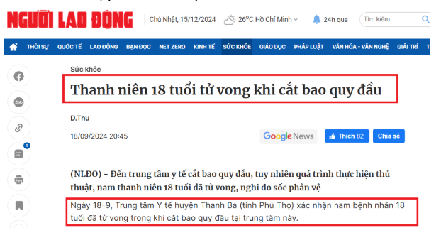 - Gần đây nhất là trường hợp nam thanh niên 18 tuổi thực hiện cắt bao quy đầu tại cơ sở y tế địa phương kém chất lượng dẫn đến đau đớn, không được xử lý kịp thời đã không may tử vong.
