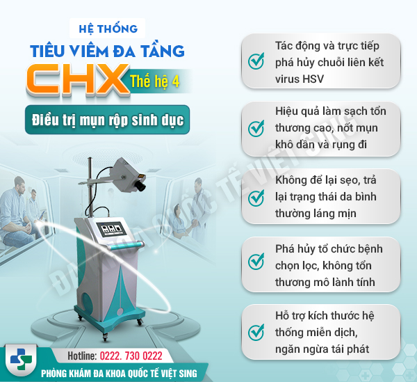 Đa khoa Quốc tế Viêtj Sing đang áp dụng hệ thống tiêu viêm đa tầng CHX thế hệ 4 điều trị tế bào, lấy tế bào từ các mô bệnh để kiểm tra, dựa trên chủng loại virus và các trạng thái truyền nhiễm khác nhau từ đó lấy nhân tố miễn dịch để tiêu diệt virus HPV, HSV từ gốc rễ.