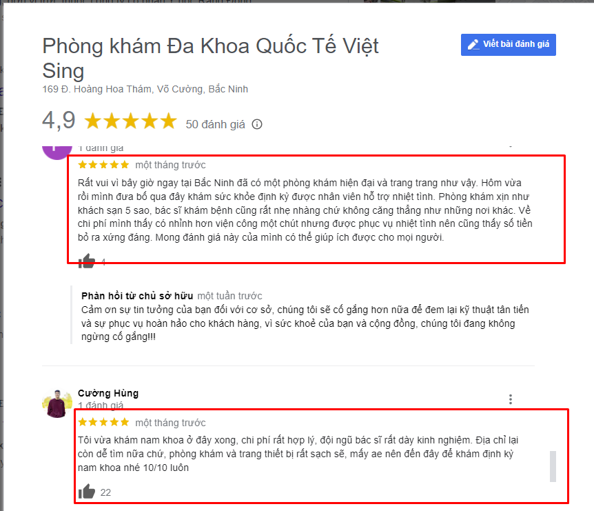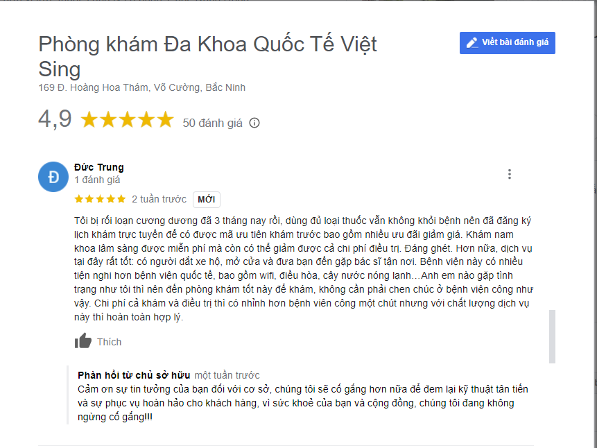 Phản hồi tích cực của anh em nam giới tại Phòng khám Đa khoa Quốc tế Việt Sing: Trong suốt thời gian làm việc và phát triển, phòng khám Đa khoa quốc tế Việt Sing Bắc Ninh đã thăm khám và điều trị hiệu quả cho đông đảo bệnh nhân và nhận về những phản hổi rất tích cực:
