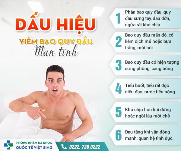 Các triệu chứng đặc trưng của viêm bao quy đầu bao gồm:Viêm bao quy đầu ở nam giới có tác động trực tiếp đến sức khỏe tinh thần và sinh lý.