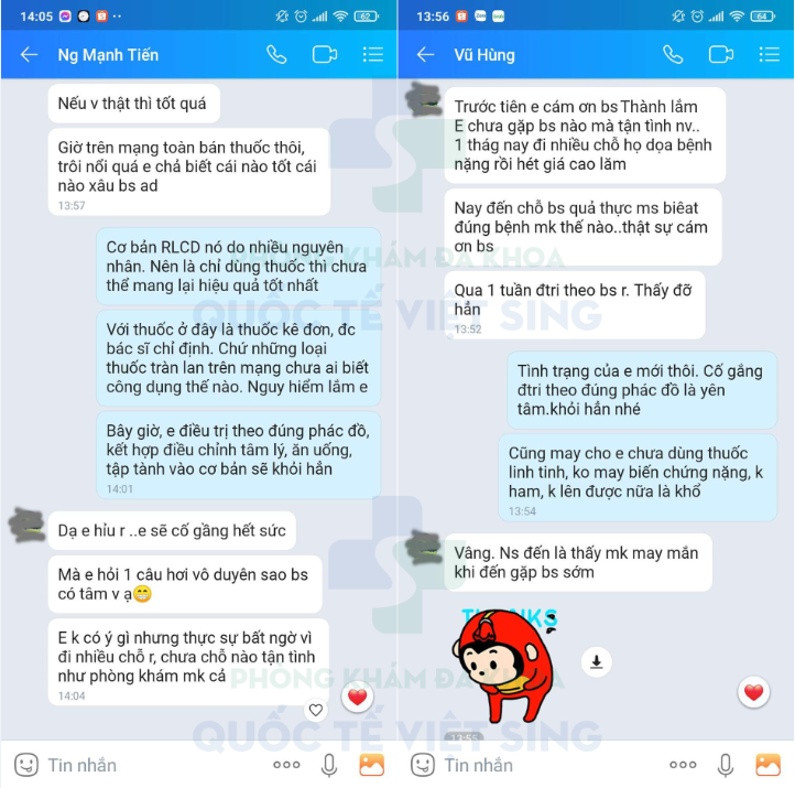 - Anh Huỳnh Văn M (Bắc Ninh): “Tôi mắc rối loạn cương dương nhưng do ban đầu chủ quan nên bệnh tình ngày càng nặng hơn khiến vợ chồng tôi thường xuyên cãi vã. Vì vậy mà tôi đã đến Đa khoa Quốc tế Việt Sing bởi gần nhà và thật may là tình hình của tôi đã thuyên giảm, giờ đây tôi và vợ đã không còn cãi vã vì chuyện giường chiếu nữa.”