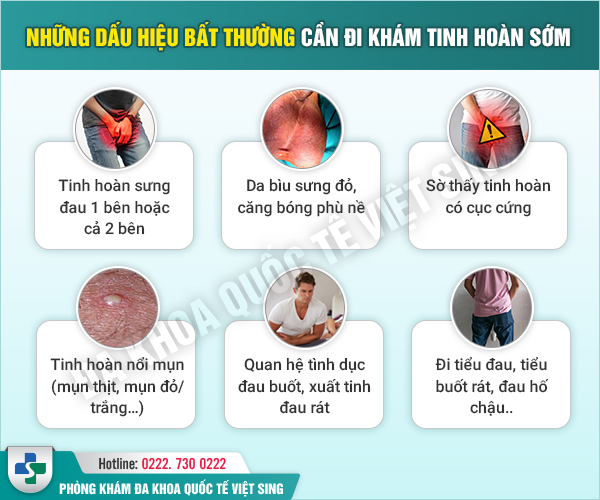 Bên cạnh đó, bác sĩ Hốt cũng cho biết, nam giới cần đi khám tinh hoàn càng sớm càng tốt nếu xuất hiện những triệu chứng bất thường như sưng tinh hoàn, đau tinh hoàn, cảm thấy có cục cứng xuất hiện ở tinh hoàn, đi tiểu thấy đau buốt, cơ thể mệt mỏi, sốt cao,…