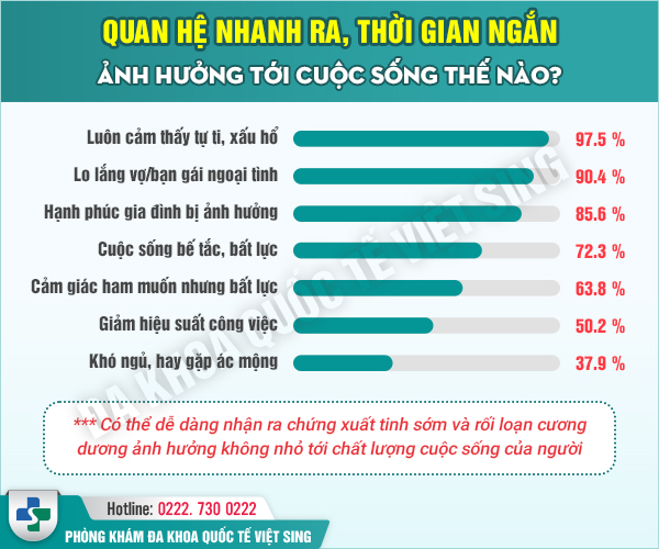 Thời gian quan hệ ngắn, quan hệ nhanh ra khiến không ít nam giới hiện nay cảm thấy xấu hổ và tự ti với người bạn đời, người bạn tình của mình. Các thống kê cho thấy có đến hơn 80% đấng mày râu từng bị ra nhanh khi giao hợp làm ảnh hưởng trực tiếp đến tâm lý, không đạt được khoái cảm tình dục như mong muốn.