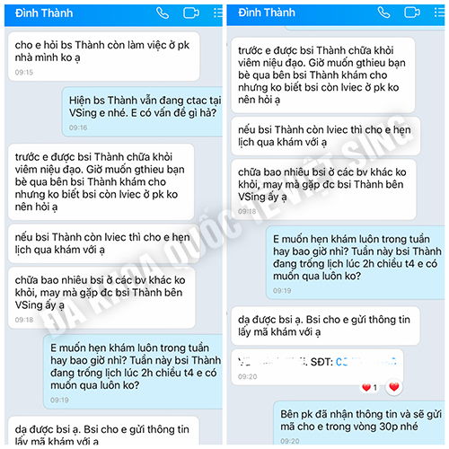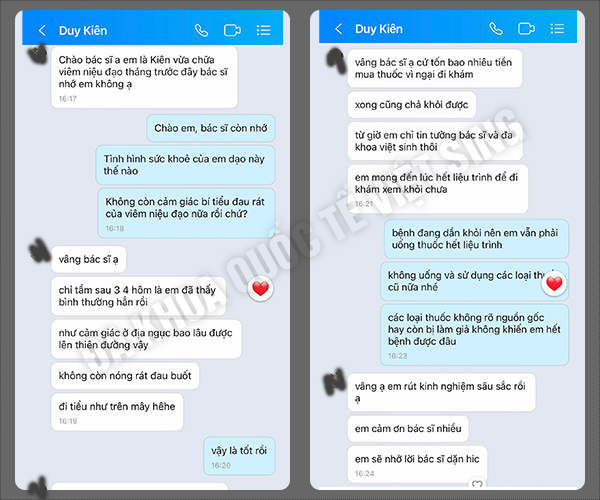 - Anh Đinh V Thanh (36 tuổi): “Mình được chẩn đoán viêm niệu đạo và chữa trị ở vài nơi nhưng không khỏi hẳn được, cứ sau 1 – 2 tháng hết thuốc là triệu chứng lại xuất hiện và khó chịu hơn rất nhiều. May quá đến với Việt Sinh gặp bác sĩ giỏi và thiết bị hiện đại sau hơn 2 tháng điều trị và kiêng kem như bác sĩ dặn mình thấy cơ thể vẫn ổn định.”
