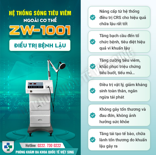 Phòng khám Đa khoa quốc tế Việt Sing Bắc Ninh là cơ sở ĐẦU TIÊN ứng dụng kết hợp điều trị bằng sóng tiêu viêm ngoài cơ thể ZW – 1001, trực tiếp khu trú phần tổn thương ngay từ buổi đầu tiên, giảm lây lan sang các bộ phận lân cận tại hệ tiết niệu sinh dục, tăng gấp 3 lần khả năng dẫn truyền thuốc trực tiếp vào khu vực viêm nhiễm giúp khỏi bệnh và giảm khả năng tái phát