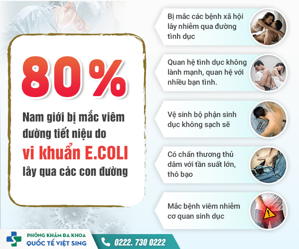 - Vi khuẩn E Coli, tụ cầu khuẩn, liên cầu khuẩn, nấm… có cơ hội xâm nhập và phát triển, gây bệnh khi vệ sinh bộ phận sinh dục chưa tốt, quan hệ tình dục không an toàn.